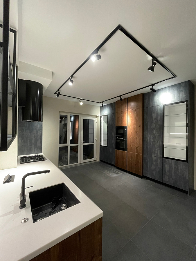 Минималистичная кухня под бетон хорошо вписывается в пространство лофта, минимализма и других современных направлений. Её главная фишка – декоративное покрытие на фасадах, воспроизводящее фактуру и оттенок бетона. Фасады гармонично сочетаются со столешницей под дерево и современной профиль ручкой-GOLA.